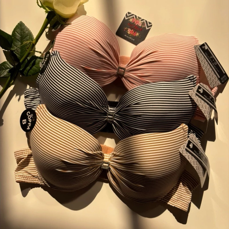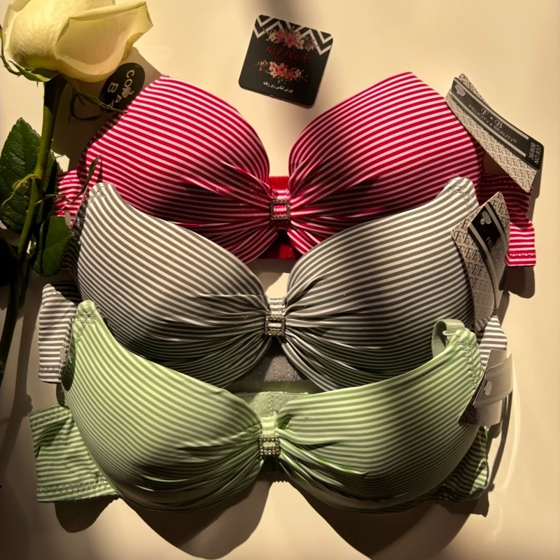 🦋 سوتین 🦋 ✅ طرح راه راه ✅ فنردار ✅ جلو کار نگین داره ✅ کاپ B ✅ کاپ کوچیکه پس بهتره یه سایز بزرگتر بردارید